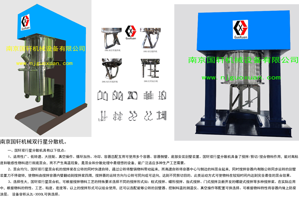 國軒機械設備有限公司位于素有六朝古都之稱:〖江蘇省省會城市南京〗公司專業從事工業攪拌機,行星分散機,雙行星混合機,三軸攪拌機,在線式混合機等設備的研發、生產、銷售為一體,產品定位于中高端,產品應用于:電池、高分子材料、焊錫膏、醫藥、化妝品、化工、膠粘劑、食品。顏料、染料和塑料等行業。公司擁有一批專業從事攪拌設備多年的優秀團隊。用現代企業的管理理念,致力于精細化管理和零缺陷作業的模式,立足于產品的質量管理......
